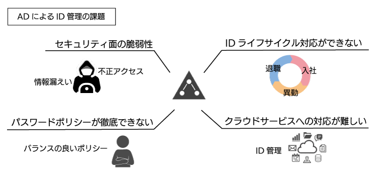従業員の入社、異動、休職、退職などの IDライフサイクルをADのみで行おうとすると、管理コンソールやコマンドラインツールを使って手動で更新を行うことになり、企業内の情報システム部門の負担が大きくなります。小さな組織であればその運用でまかなえたとしても、大きな組織であればあるほど迅速かつ正確に対応できなくなる傾向があります。また、誤った設定(一般ユーザーに対して不必要な権限を設定する、管理者に対して必要な権限を与えていない、退職者の情報がADに残り続ける 等)が発生した場合は、セキュリティリスクが高くなります。