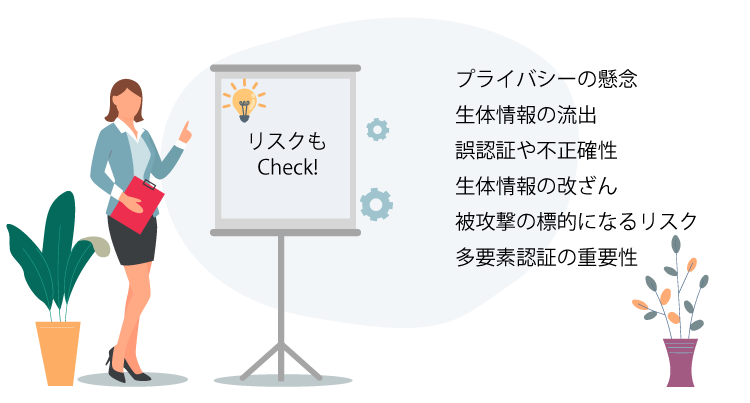 生体認証を利用したシステムでは、これらのリスクに対応した形で提供しているものもありますが、あらかじめこれらのリスクを念頭に置くことも重要です。