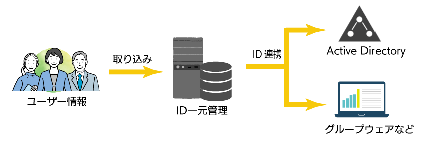 IDの数が多くなればそれだけ管理が煩雑化します。それを解消するため、ID管理システムは、ユーザー情報をシステム内に「取り込み」、ユーザー情報を一元的に管理し、組織で利用するシステムやサービスに「連携」する機能を持っています。