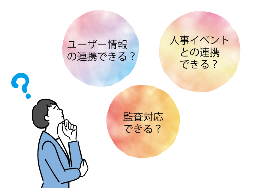 社内で利用しているクラウドサービスやオンプレシステムへのプロビジョニングなど、ID管理システムが連携できるか確認しましょう。