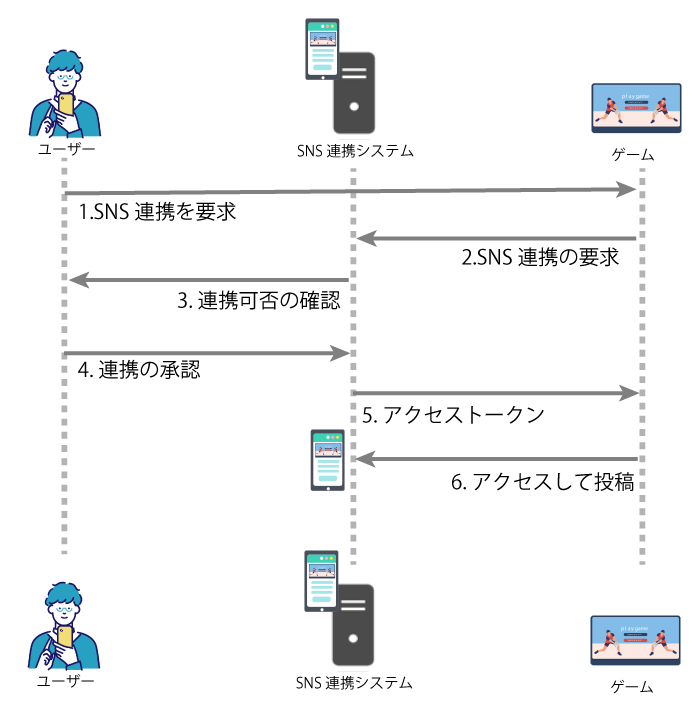 5. SNS連携システムがゲームに対して、SNSにアクセスするのに必要な情報となる「アクセストークン」を提供します。これによって、SNSとの連携設定が完了となります。