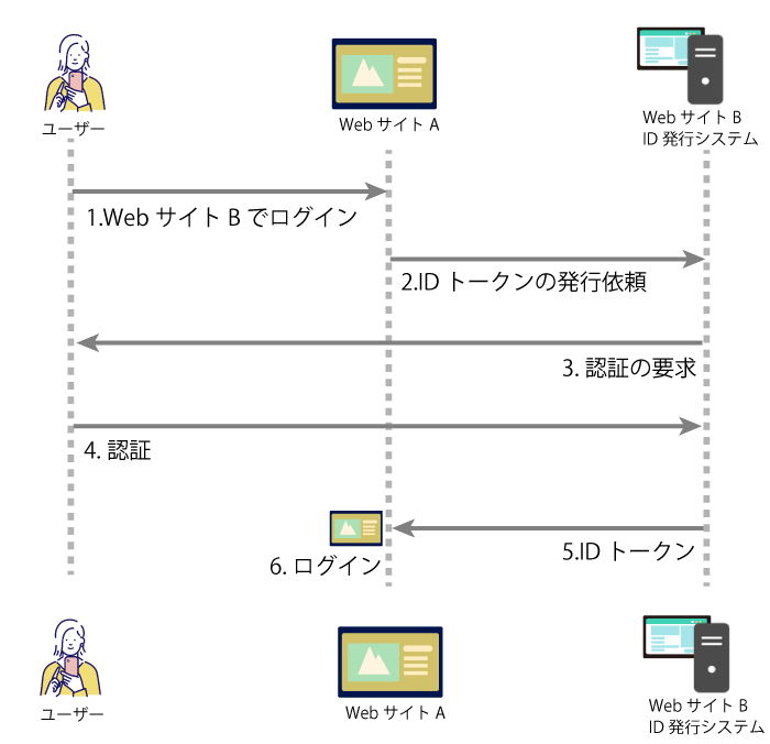 例として、「WebサイトA」にログインするために「WebサイトB」のログイン情報を使用する場合は、次のような手続きがふまれて、ログインされます。