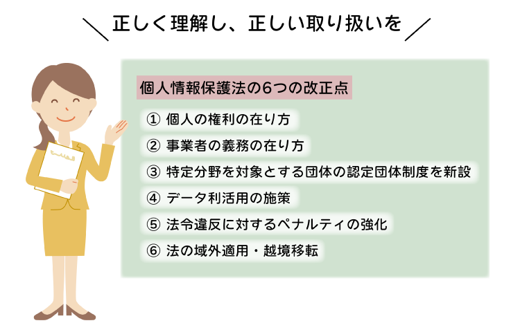 個人情報の取り扱いが厳格化され、漏えい時には通知が「完全義務化」され、「厳罰」が科されます。ここからは、2022年の改正で設けられた改正点6つを解説します。