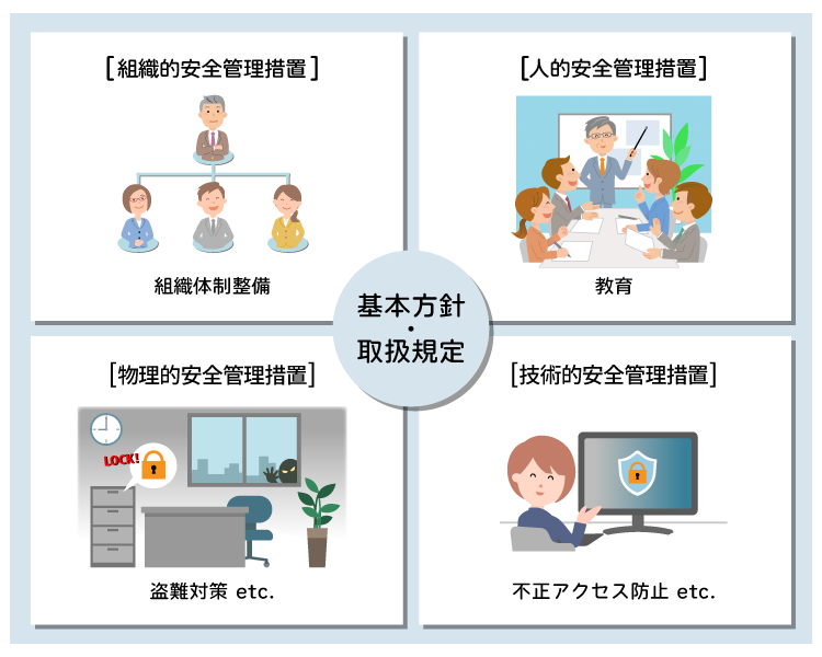 情報の漏えいや、き損などを防ぐための安全管理措置は「組織的・人的・物理的・技術的」の4つに分類されています。事業者はこれらの内容を理解し、情報を安全に管理する体制を構築しなければなりません。