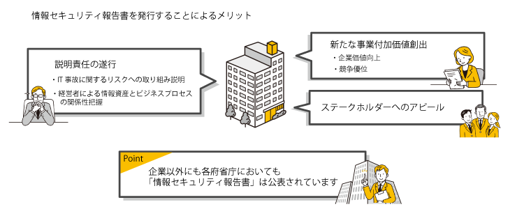事業のIT依存度が高まっている中で、この報告書を通じてIT事故に関するリスクへの取り組みについてステークホルダーに説明できる。また、この報告書の準備過程において、経営者自身が情報資産とビジネスプロセスの関係性を把握し、情報セキュリティの取り組みに対する説明責任を果たすことができる。