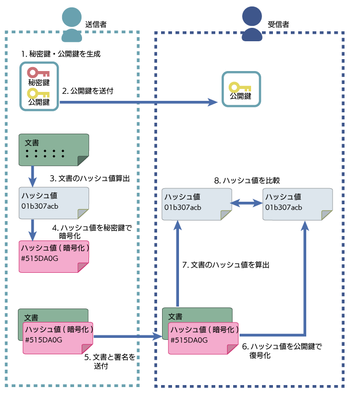 通常、デジタル署名は、署名を行う送信者側と署名の検証を行う受信者側との間で、次のような流れでデータの本人性と非改ざん性の証明を行っています。