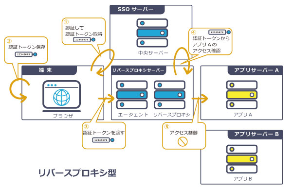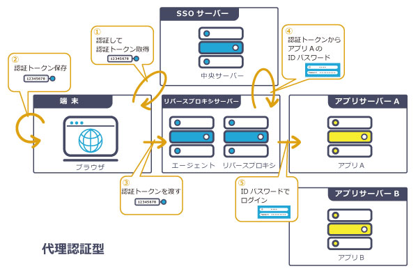 リバースプロキシサーバにインストールしたエージェントがアプリケーションにユーザーIDとパスワードを送信する方式です。