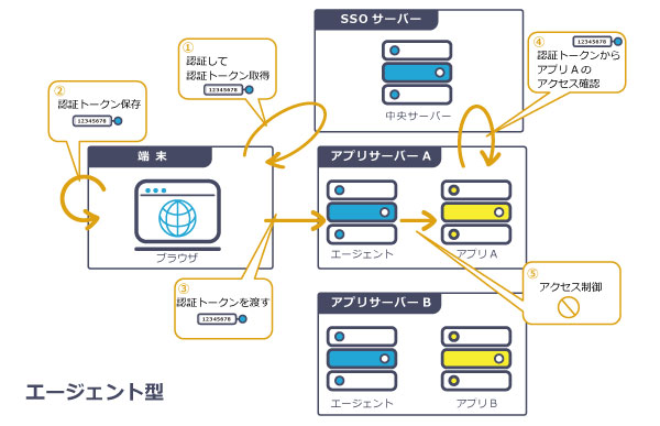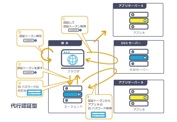 WebのSSOとは区別することがありますが、同様の動作を提供する仕組みです。クライアント端末にインストールしたエージェントがIDとパスワードを送信する方式です。エージェントには「ネィティブアプリ」「ブラウザ拡張機能」「専用ブラウザ」などがあり、Webアプリケーションに限らずネィティブアプリケーションにもSSOが適応できるもの(ネイティブアプリ)、特定のWebブラウザに特化して認証強化できるもの(ブラウザ拡張機能)、クライアント証明書等で認証強化できるもの(専用ブラウザ)など、製品によって色々な付加機能が提供されています。