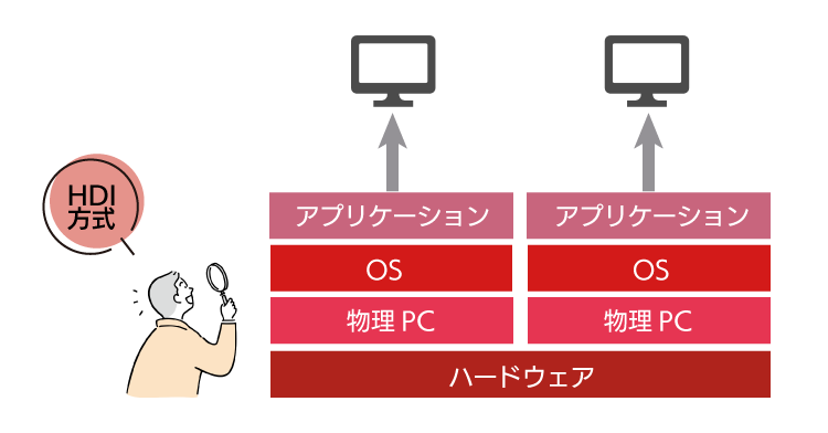 物理サーバー上に個々の仮想デスクトップを作成し、基本的にはクライアント端末と仮想デスクトップを1対1で利用する方式です