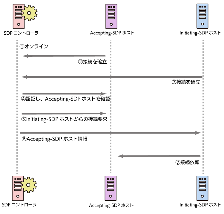⑤ 接続依頼が正しい場合、SDPコントローラは、Accepting-SDPホストに対して、Initiating-SDPホストからの接続要求を送ります。